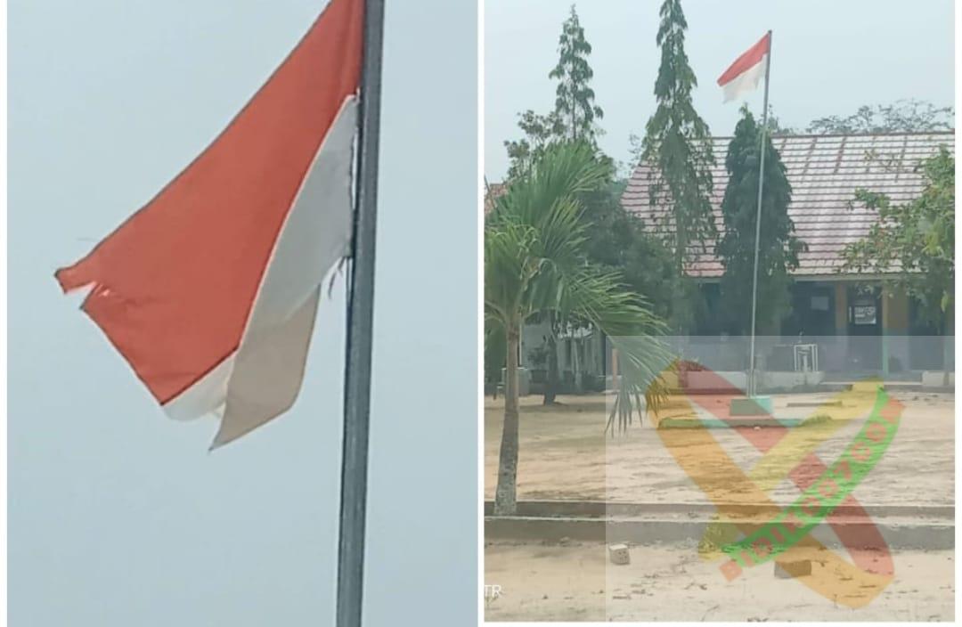 BIDIK007.com Bendera Merah Putih yang kondisinya sudah usang dan robek masih saja berkibar di depan gedung SDN 08 panca jaya Desa Fajar asri Kecamatan panca jaya kabupaten mesuji.
