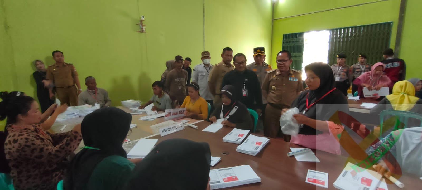 Mesuji.Penjabat Bupati Mesuji Drs Sulpakar, MM di dampingi beberapa pejabat eselon dua dan tiga Pemkab Mesuji melakukan pemantauan Kegiatan Sortir dan Lipat Suara Pemilu 2024 di Gedung Olahraga (GOR) Kecamatan Tanjung Raya di Desa Brabasan, Kabupaten Mesuji,Senin (08/01/2024).