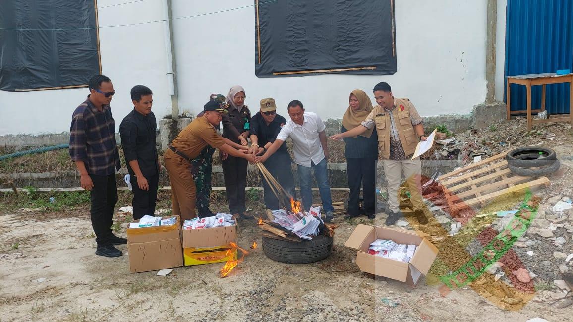 Mesuji – Ketua KPU Kabupaten mesuji Ali yasir,st bersama bawaslu,polres mesuji, dandim 0426 tuba dan kejaksaan Kabupaten mesuji memusnahkan surat suara rusak dan sisa di Halaman GOR brabasan, Kabupaten mesuji, lampung, Selasa (13/2/2024).