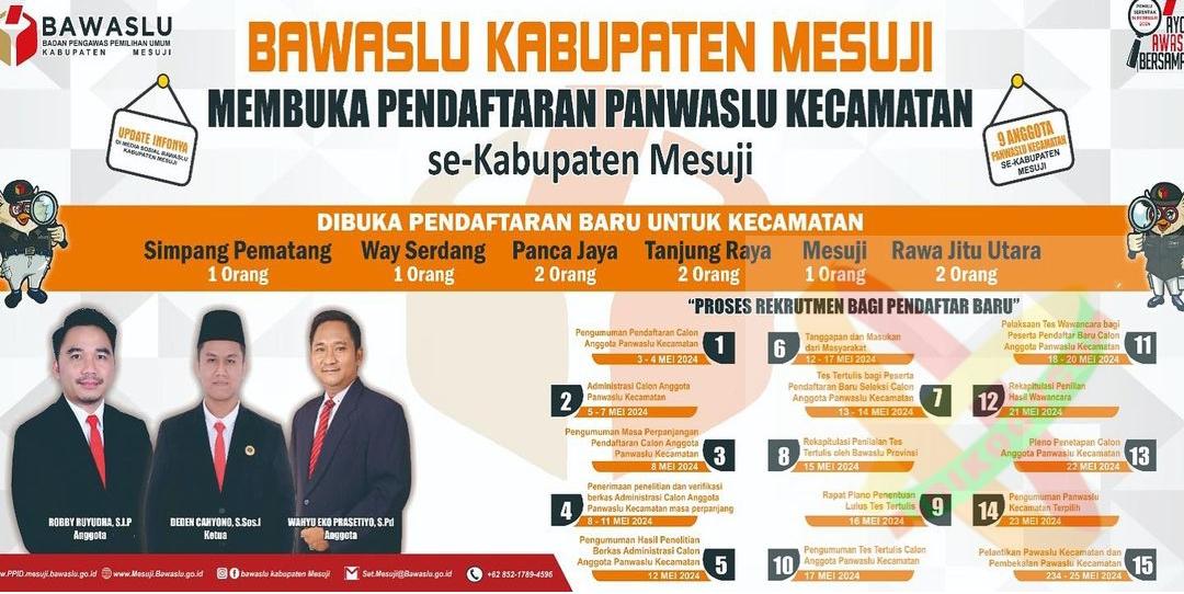 Bawaslu Kabupaten Mesuji mengumumkan pembukaan pendaftaran anggota baru untuk Panitia Pengawas Kecamatan (Panwaslu) yang akan berlangsung dari tanggal 5 hingga 7 Mei 2024.