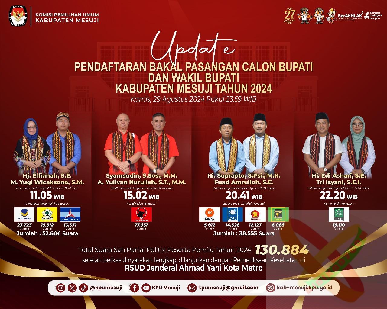 Berdasarkan PKPU 2 Tahun 2024 tentang Tahapan dan Jadwal Pemilihan Gubernur dan Wakil Gubernur, Bupati dan Wakil Bupati, serta Walikota dan Wakil Walikota Tahun 2024, tahapan Pendaftaran Pasangan Calon dilaksanakan pada tanggal 27 sampai dengan 29 Agustus 2024. Pada tahapan ini terdapat 4 (empat) Bakal Pasangan Calon yang mendaftar ke KPU Kabupaten Mesuji yaitu : 1. Hj. Elfianah, S.E. dan M. Yugi Wicaksono, S.M. yang mendaftar pada tanggal 28 Agustus 2024 pukul 11.05 WIB dengan didukung 3 (tiga) partai politik yaitu Partai Nasdem, Partai Golkar dan Partai Demokrat dengan jumlah seluruh suara sah gabungan partai politik pengusung sebanyak 52.606 suara; 2. Syamsudin S.Sos., M.M. dan A.Yulivan Nurullah, S.T., M.M yang mendaftar pada tanggal 29 Agustus 2024 pukul 15.02 WIB dengan didukung 1 (satu) partai politik yaitu Partai Demokrasi Indonesia Perjuangan dengan jumlah suara sah 17.631 suara; 3. Hi.Suprapto, S.Psi., M.H. dan Fuad Amrulloh, S.E. mendaftar pada tanggal 29 Agustus 2024 pukul 20.41 WIB dengan didukung 4 (empat) partai politik yaitu Partai Keadilan Sejahtera, Partai Amanat Nasional, Partai Gerindra dan Partai Persatuan Pembangunan dengan jumlah seluruh suara sah gabungan partai politik pengusung sebanyak 38.555; serta 4. Hi. Edi Ashari, S.E. dan Tri Isyani, S.E.I. pada tanggal 29 Agustus 2024 pukul 22.20 WIB dengan didukung 1 (satu) partai politik yaitu Partai Kebangkitan Bangsa dengan jumlah suara sah 19.110 suara.