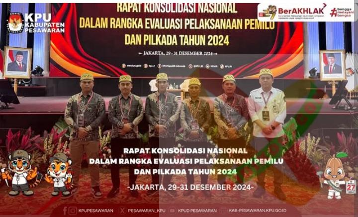 Bidik 007.Ketua KPU pesawaran Fery Iksan , dan anggota KPU kabupaten pesawaran Riyan arnando , Evan sefdiyansyah , Dede Fadilah dan Ferli nitip Yudha bersama sekretaris KPU kabupaten pesawaran Sepriyantoni hadir dalam acara rapat konsolidasi Nasional Dalam rangka Evaluasi pelaksanaan pemilu dan pilkada tahun 2024 di Jakarta. 29s.d 31 Desember 2024.