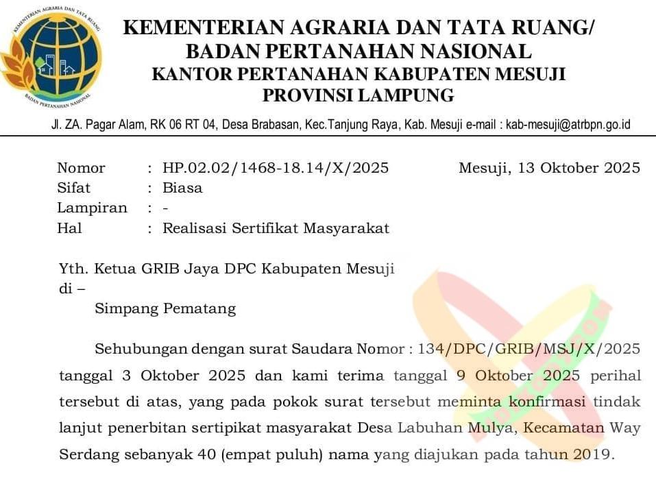 Surat balasan dari BPN Mesuji tersebut, yang diterima langsung oleh DPC Grib Jaya Mesuji, menyatakan bahwa Kantor Pertanahan Kabupaten Mesuji saat ini sedang melaksanakan inventarisasi, penelitian, dan pengumpulan data sebagai bagian dari proses penanganan dan penyelesaian masalah yang dimaksud.