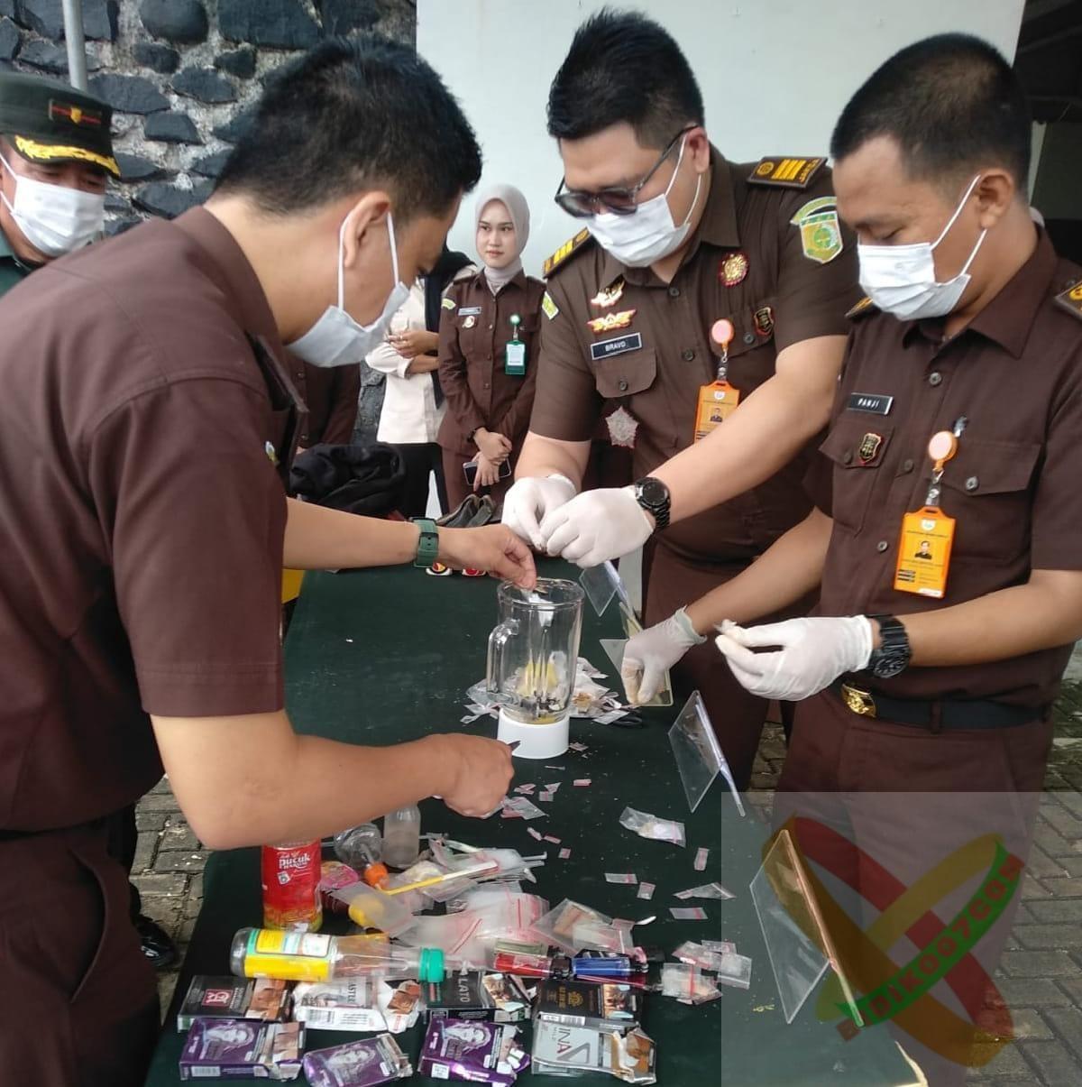 Pemusnahan barang bukti dapat dilakukan dengan cara, Penghancuran Barang bukti dihancurkan dengan cara dibakar, dihancurkan, atau dimusnahkan dengan cara lain Mengunakan mesin belender terlihat melalui video awak media